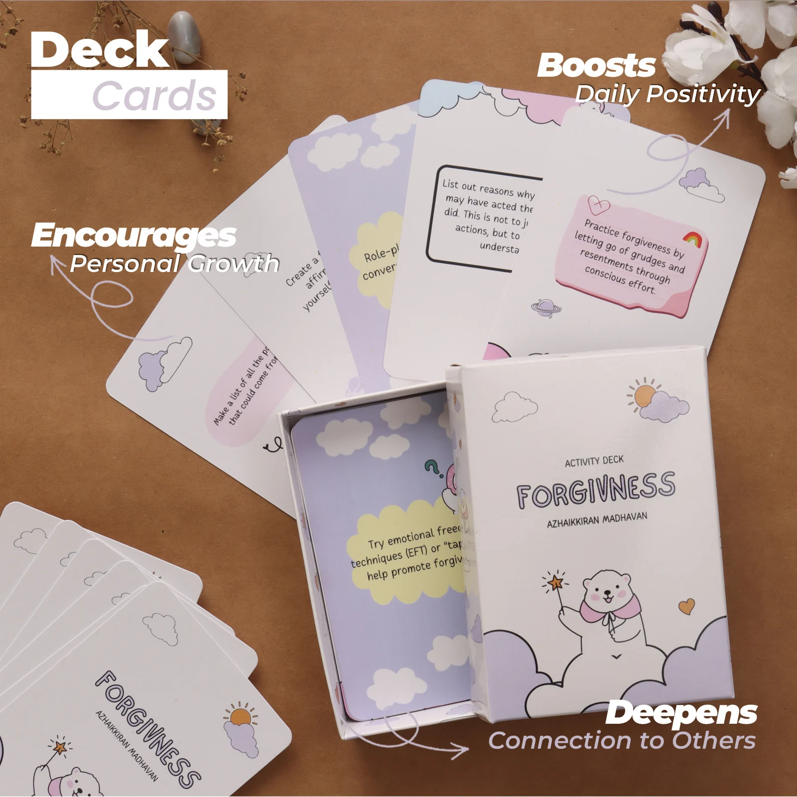 Experience the profound transformation that comes from embracing forgiveness with our Forgiveness Activity Deck. Let each card guide you on a journey of healing, liberation, and inner peace as you release old wounds and open your heart to a brighter future filled with love, compassion, and forgiveness.