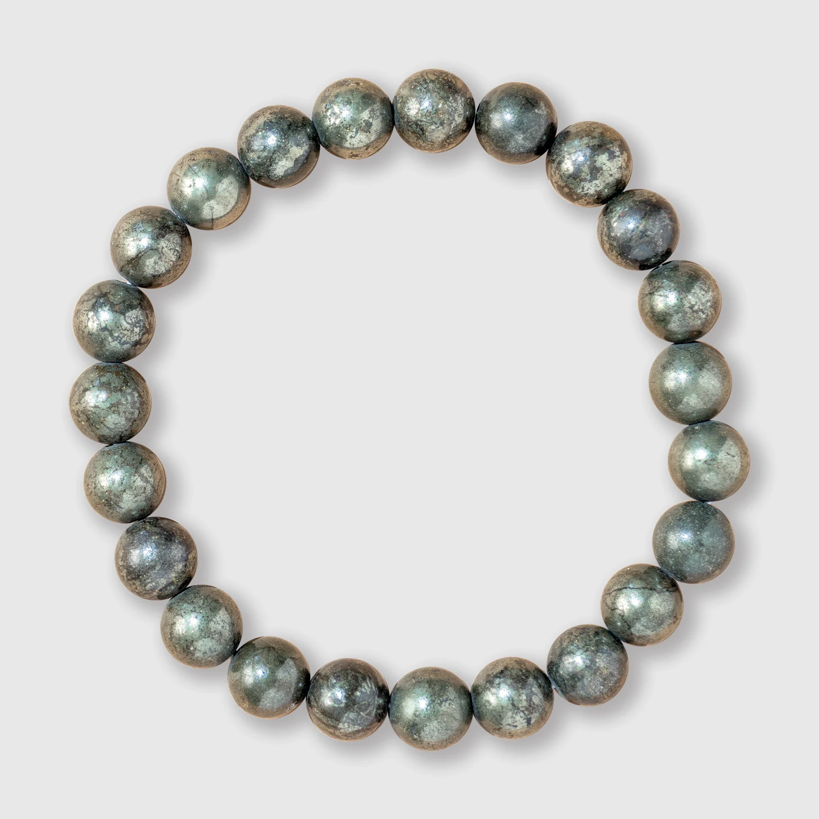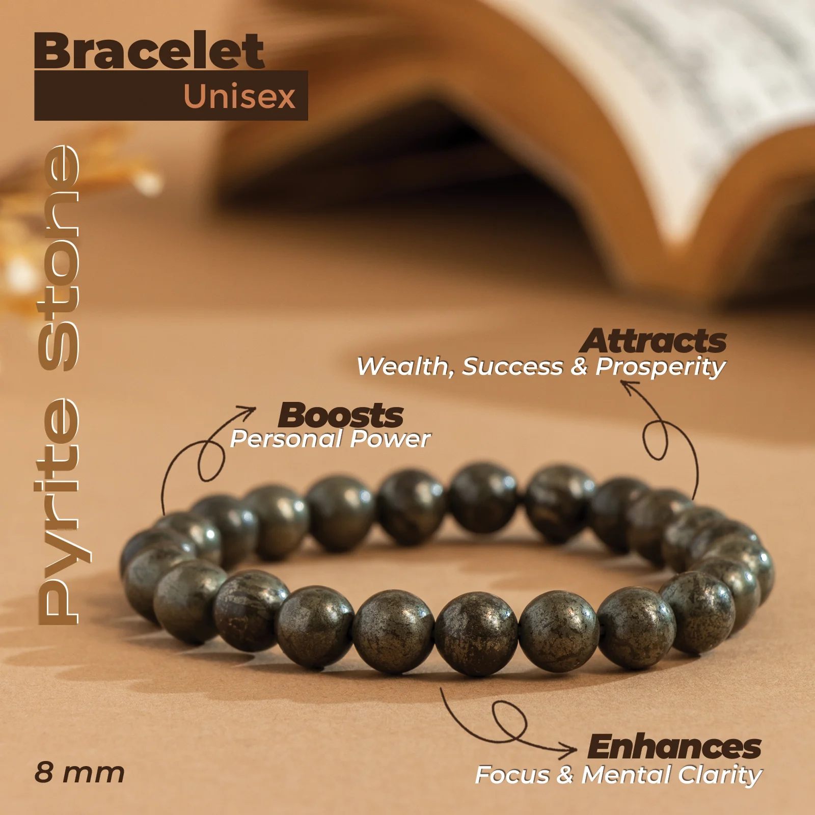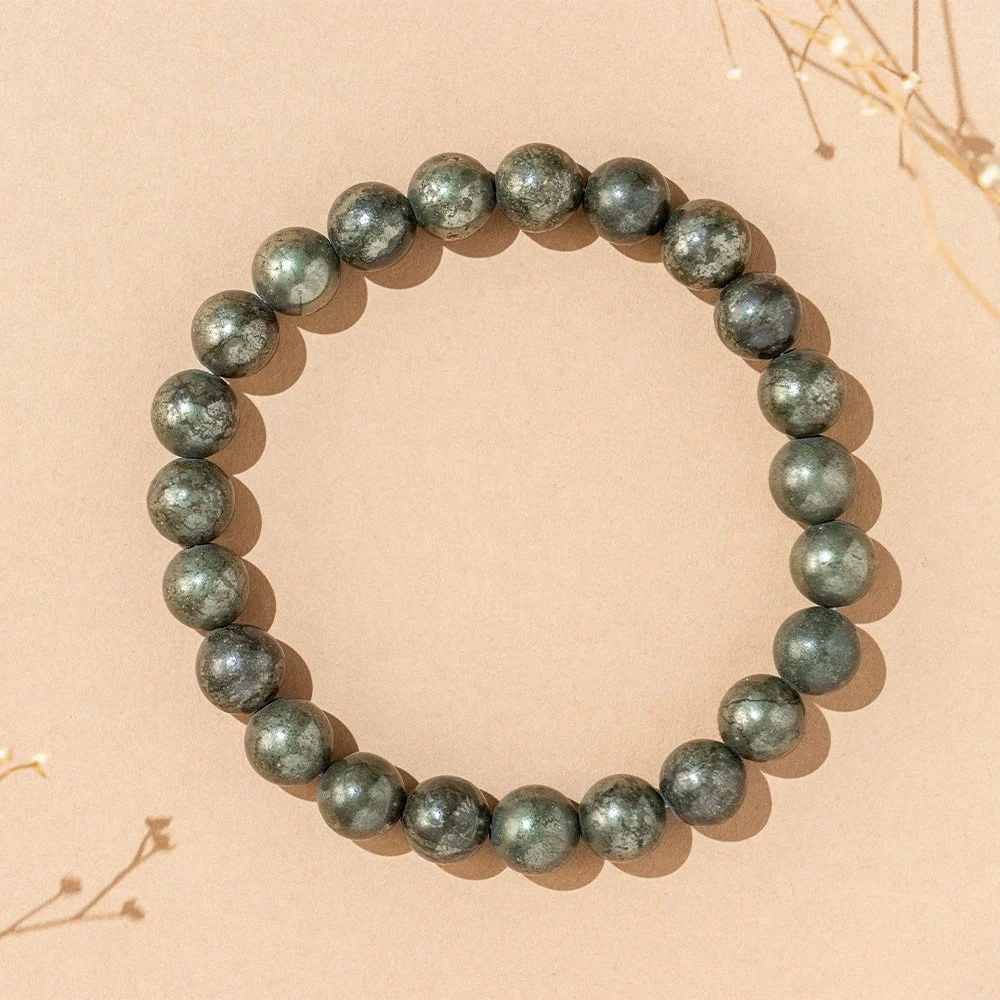 - The Pyrite Stone Bracelet is meticulously crafted, with each stone polished to perfection. Sized at about 8 mm, it radiates elegance and sophistication.
